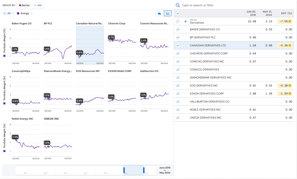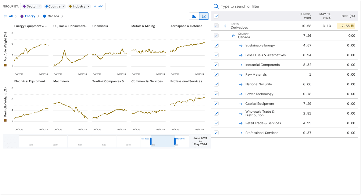 Redesigned a complex portfolio exposure visualization to help users see long-term trends and key drivers more clearly. I added both area and line chart options so users could view composition or make comparisons, and made it possible to group and drill down by asset class, sector, country, or company. This turned a static, hard-to-read chart into an interactive tool that helps investors make decisions more quickly and confidently.