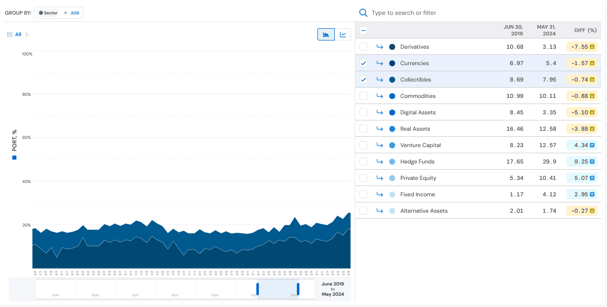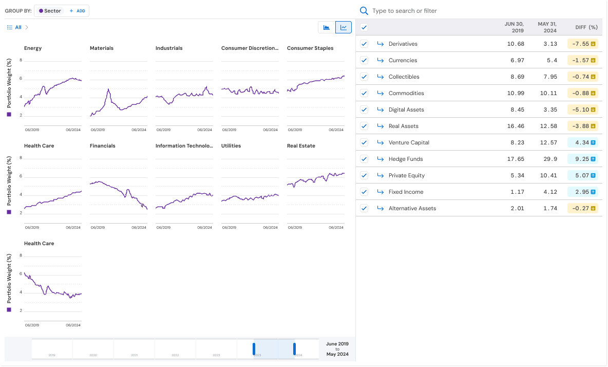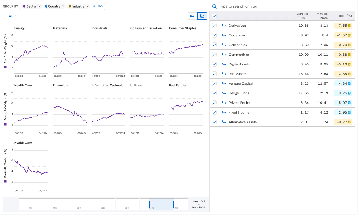 Exposure Time-Series is a portfolio analytics experience designed to help institutional investors and advisors understand how asset exposure evolves over time. The original experience relied on a single stacked area chart that was visually dense, hard to interpret, and offered limited insight beyond high-level trends.